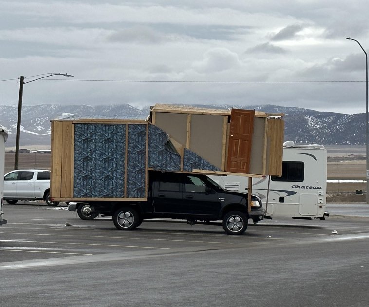 “Такой вот дом на колесах встретил сегодня на стоянке. По фото не видно, но рама, на которой выстроена эта крепость, погнута, и выглядит очень ненадежной.”