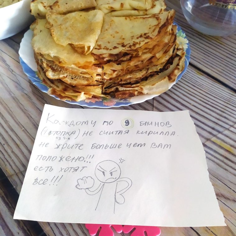 8. “Моя дочь сегодня приготовила блинчики, и она строго контролирует количество еды, которую может съесть каждый домочадец”