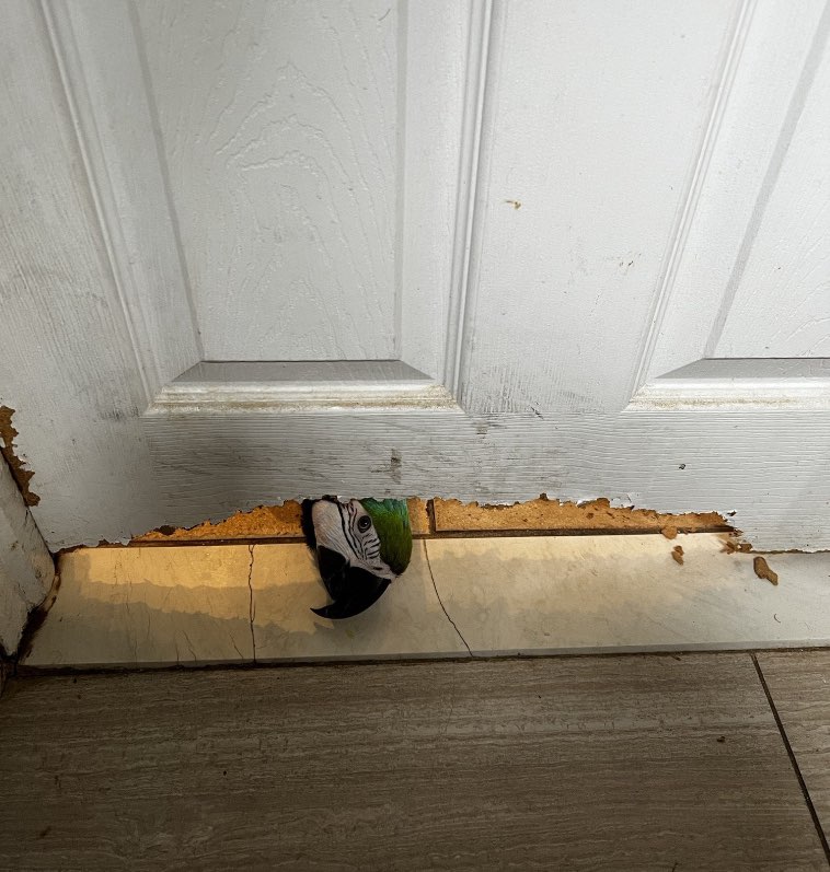 1. “Попугай не любит, когда я закрываюсь в ванной, поэтому он всячески пытается ко мне пробраться. И, как видно по состоянию двери, скоро уединиться я уже не смогу.”