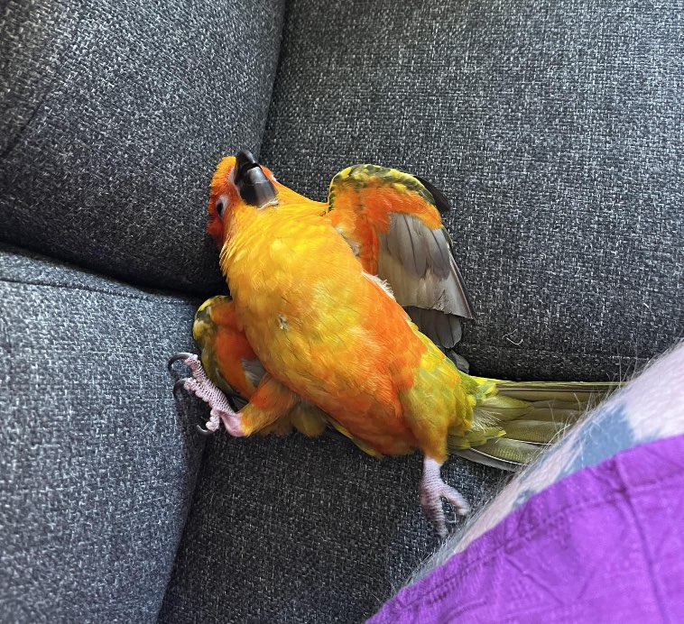 2. Некоторые попугайчики напоминают котов. Они так же любят поваляться на диване пузом кверху.