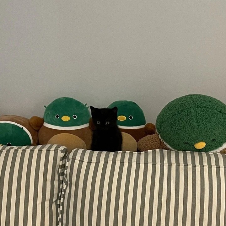 2. “Мы только что принесли этого маленького черного пушистика домой, и он сразу побежал знакомиться с мягкими игрушками”