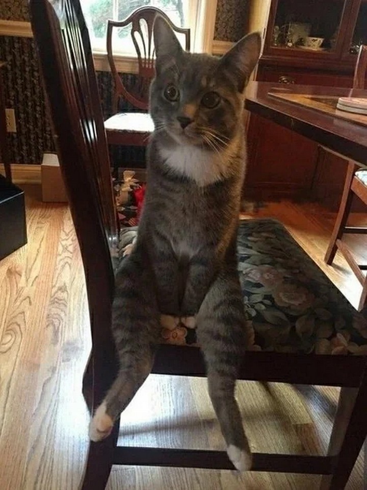16. “Как думаете, если кот научился сидеть в такой позе, то не пора ли разрешить ему обедать с нами за общим столом?”