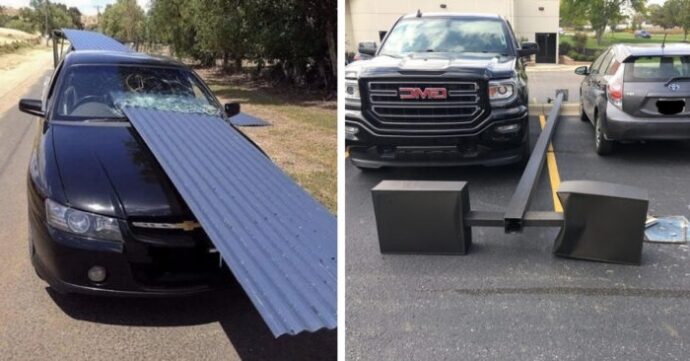 Эти листы металла выпали с задней части грузовика прямо в окно автомобиля! Еще бы несколько сантиметров вправо и водитель был бы мертв, но он покинул салон целым и невредимым.
