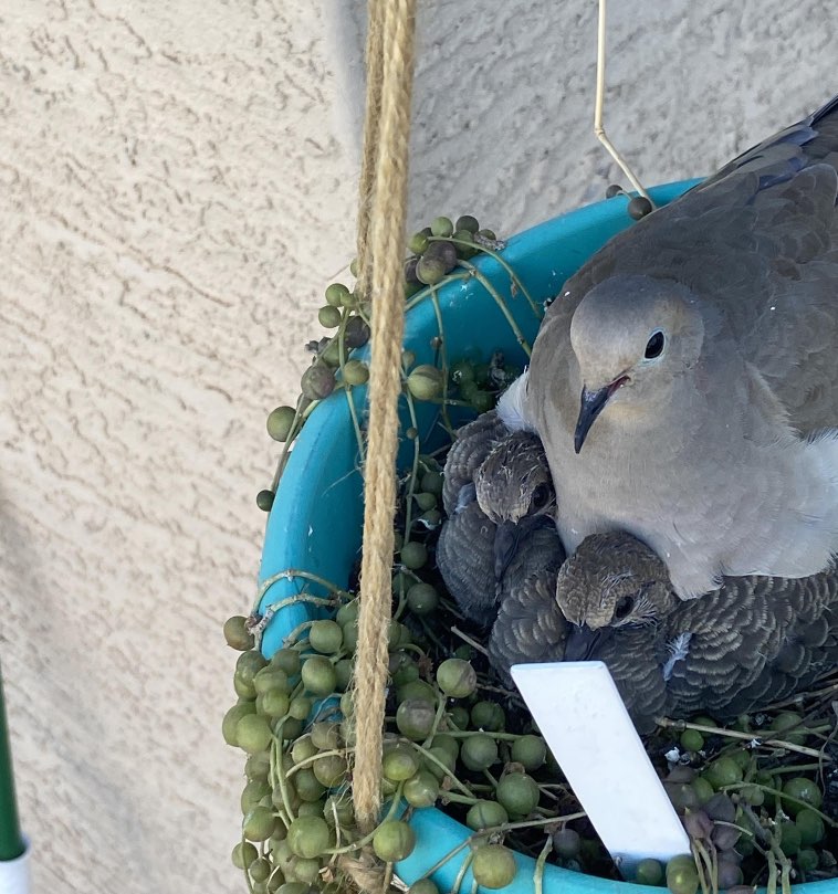 4. “Семейство голубей решило поселиться в горшке с Крестовником Роули. Надеюсь, им там удобно.”