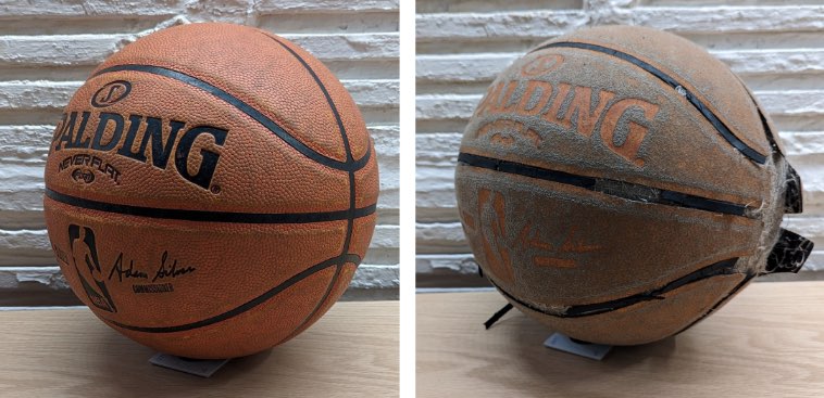 9. Это два одинаковые баскетбольные мячи. Просто тем, что справа, на протяжении 5 лет играли во дворе, а тот, который слева, использовали только в помещении.