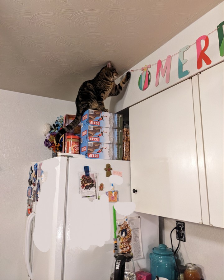 12. “Похоже наш кот превратился в Гринча. Вначале он перекинул елку, которую мы поставили перед Рождеством. А теперь забрался на холодильник и пытается уничтожить и другие атрибуты праздника.”