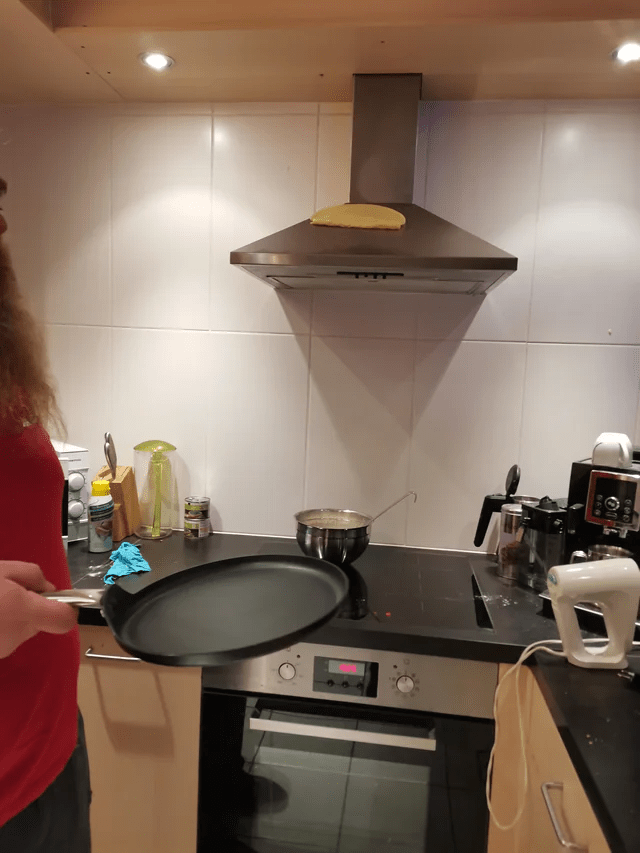 Он хотел перевернуть блинчик в воздухе, но не вышло