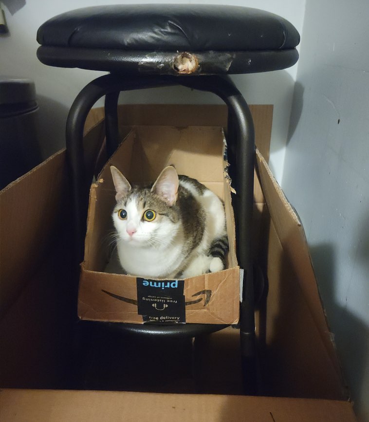 “Моя кошачья башня из барного стула и двух коробок. Ему нравится.”