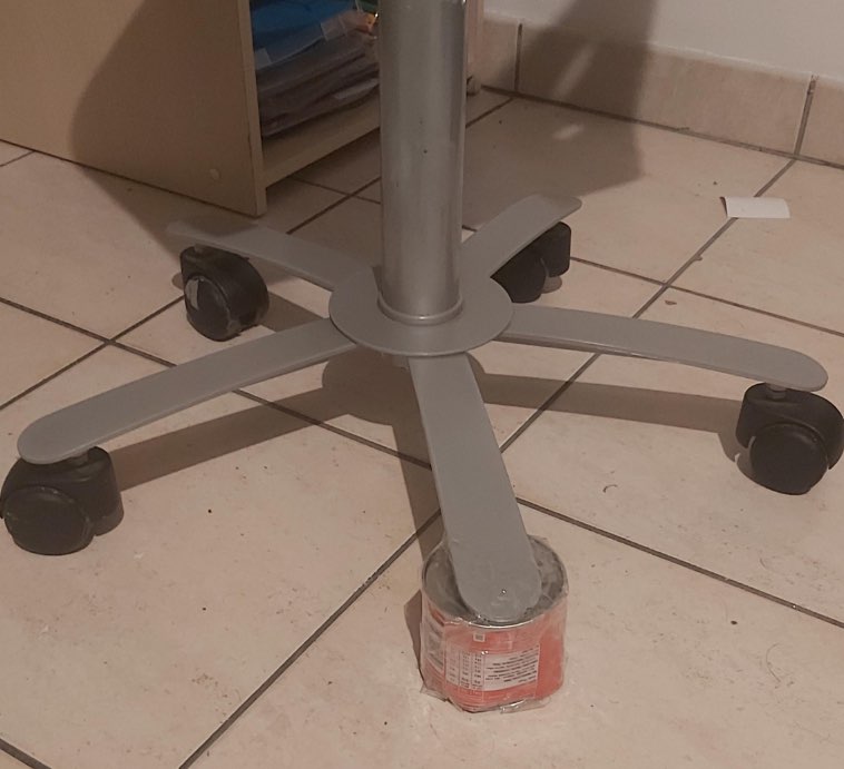 “Одно из колес моего стула сломалось и его нельзя было прикрутить обратно, поэтому пришлось быстро придумать какое-то решение”