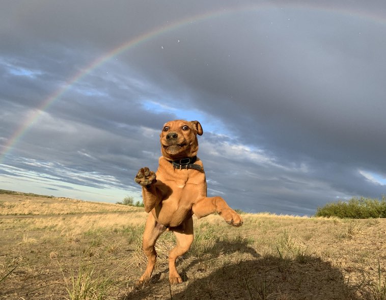 “Мой слегка сумасшедший пес резвится на фоне прекрасной радуги. Почему-то кажется, что примерно так выглядит рай.”