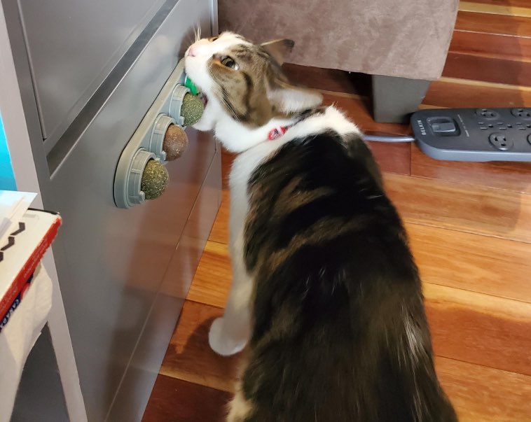 “Похоже, мой кот без ума от доски с кошачьей мятой, которую мы прикрепили на холодильник специально для него”