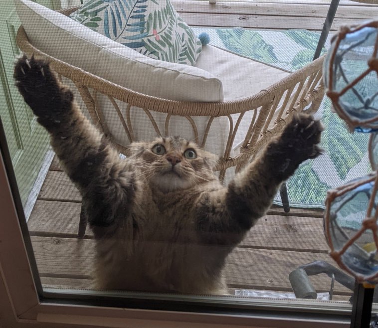 11. Кошка просит впустить ее с патио в дом, задействовав при этом всю свою экспрессию