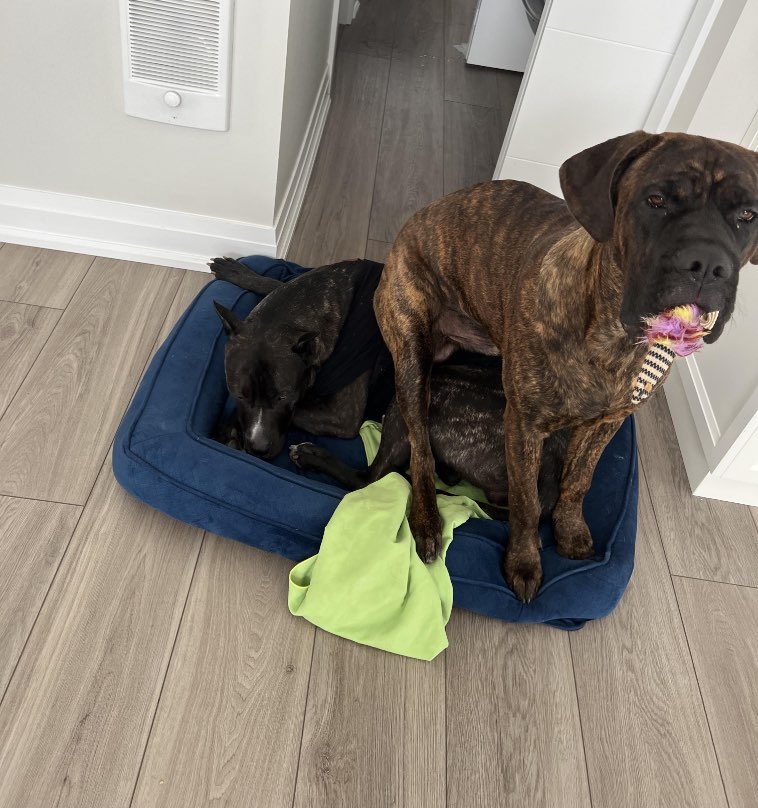 12. Просто одна из собак решила, что все лежанки в доме принадлежат исключительно ей