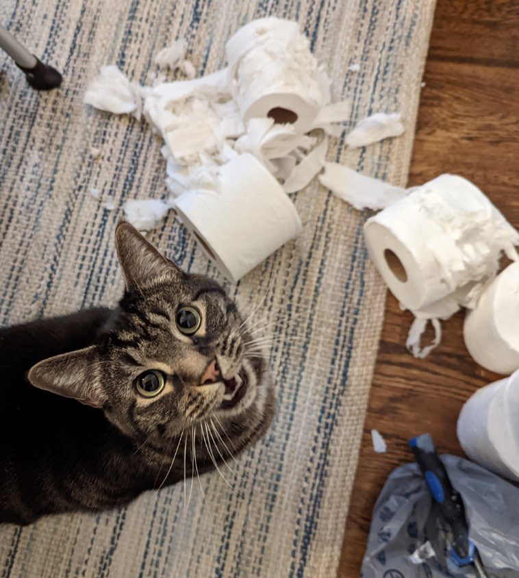 15. Котик горд собой, ведь он всего за один заход разделался сразу с тремя рулонами туалетной бумаги