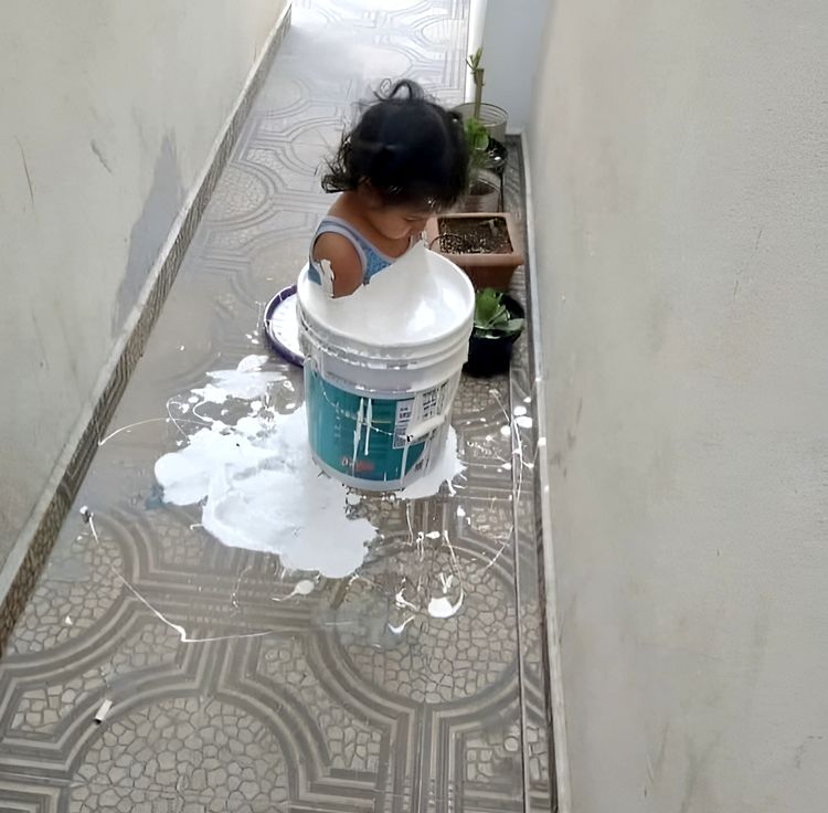 Мы очень надеемся, что это не масляная краска. Ну, по крайней мере, девочка не прыгнула в ведро головой вперёд ????