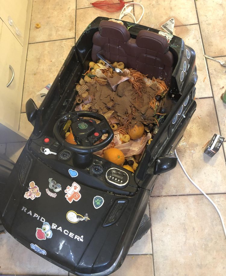 Если внимательно присмотреться к «салату», то можно заметить, что ребёнок любезно положил в него ложку. Вероятно, это последний детский автомобиль в жизни этого малыша.