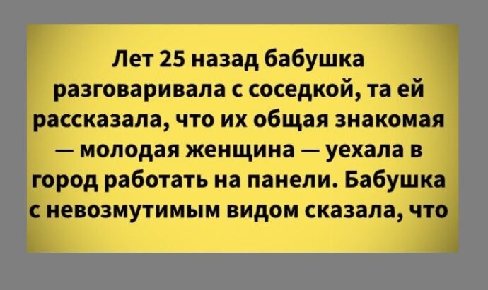 Лет 25 назад бабушка разговаривала с соседкой, та ей рассказала, что их общая знакомая — молодая женщина — уехала в город работать на панели. Бабушка с невозмутимым видом сказала, что все профессии нужны и по-своему важны и этой работой должен кто-то заниматься. Соседка была шокирована услышанным, но согласилась, ведь бабушка была авторитетом на их придомовой скамейке. И только через некоторое время бабушка узнала, что работать на панели означало работать проституткой, а не разнорабочей на строительных лесах.