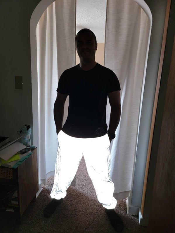 16. “Нашел штаны из светоотражающего материала. Теперь в темноте разглядеть меня будет весьма просто.”