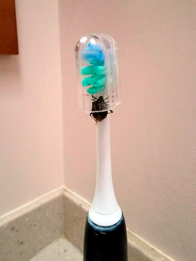 «Уже несколько лет коричневые мраморные клопы сверхинвазивны в этой части Соединенных Штатов, где я живу. Когда приходят холода, они будут любыми способами пытаться проникнуть в ваш дом. Мои домашние крысы умеют ловить и есть их всякий раз, когда я выпускаю их поиграть. Каждый человек описывает их запах по-своему. Для меня они пахнут гнилыми огурцами», — написал автор фото.