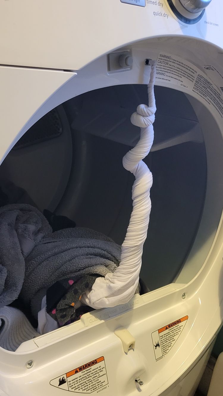 Как сообщается это произошло из-за того, что часть одежды застряла между уплотнителем и дверцей. Во время стирки/сушки одежда закрутилась настолько, что превратилась в верёвку, которая потянула за собой уплотнитель в барабан. Самое печальное, что такие случаи не являются гарантийными.