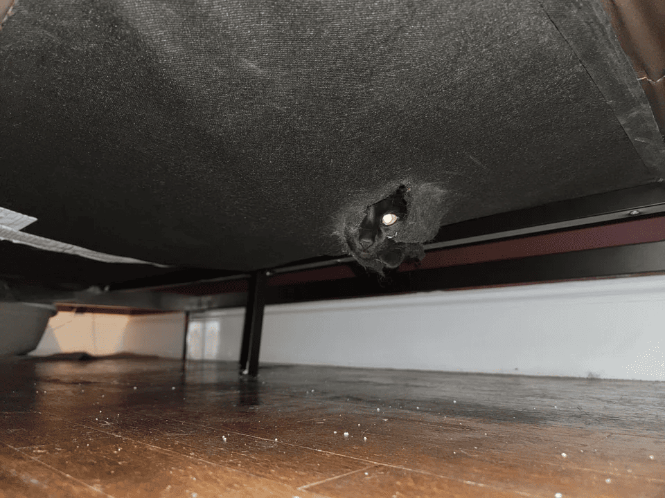 Она не хотела ехать к ветеринару и поэтому она прогрызла дыру в мебели и пряталась в ней