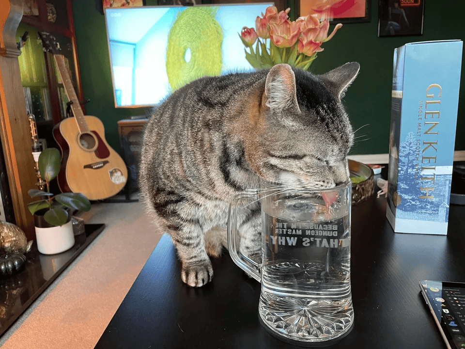 У него есть своя поилка, но вода в моём стакане для него вкуснее
