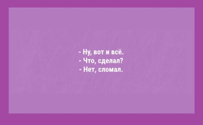 8. Мужик сидит дома, вдруг начинаются мощные глухие удары в пол, от соседа снизу. Все аж трясется. Потерпев минут десять, он спускается, звонит. Открывает пьяный сосед, на голове каска: