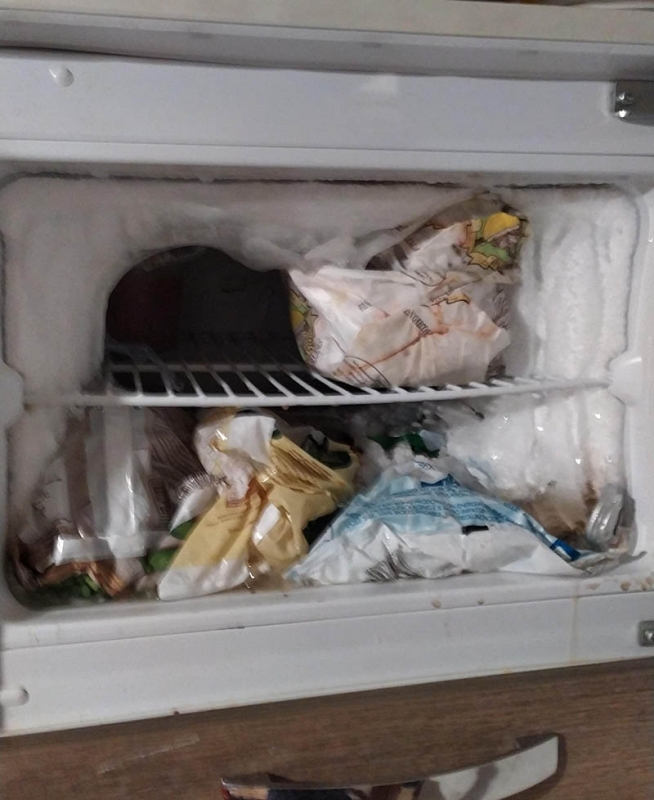 Если оставить газировку в морозилке, она превратится в лед и взорвет бутылку. Но тут сила взрыва еще и распахнула дверцу. А хозяева 2 недели были в отпуске.
