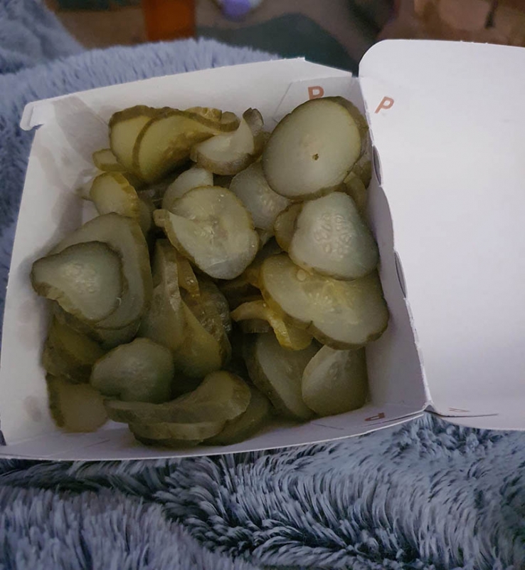 Вместо куриных нагетсов прислали целую коробку соленых огурчиков. Неплохо, но не то, что хотелось.