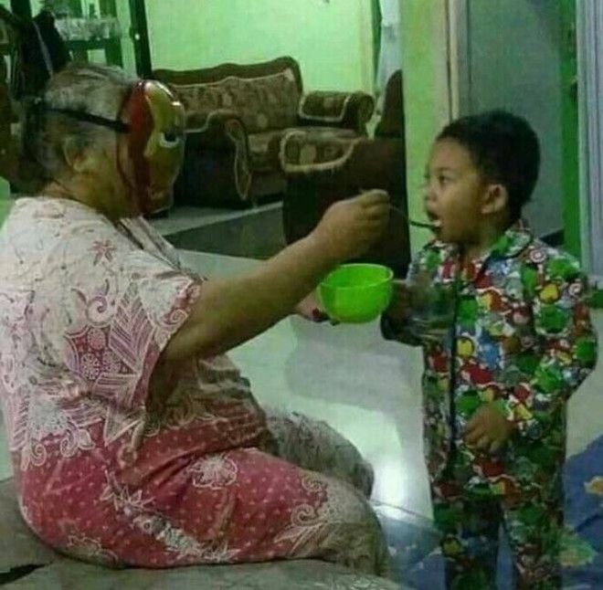 Бабушка может стать даже Железным человеком ради того, чтобы внук поел