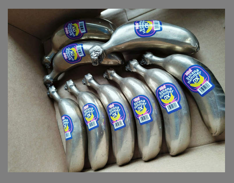Iron Factory Ikeda, типичный завод по производству прецизионных металлов в Хиросиме, Япония, начал производить молотки в форме банана в 2019 году, а годом позже выпустил стальные молотки-бананы. За прошедшие годы компания разработала различные варианты этого необычного продукта, в том числе уменьшенные версии, созданные по образцу детских бананов.