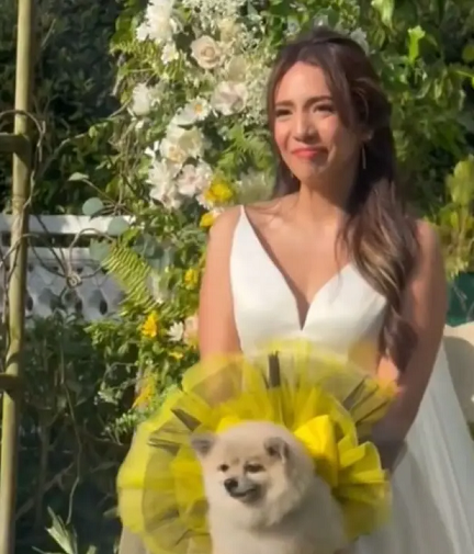 Джоэль Ювиенко, создатель контента TikTok, шла к алтарю на своей свадьбе со своим любимым шпицем Саго в качестве букета.