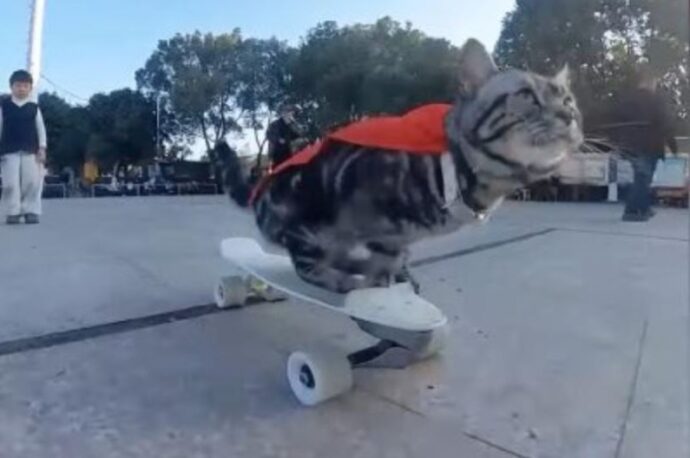 Он сказал, что кошке потребовалось около года, чтобы овладеть искусством катания на скейтборде.