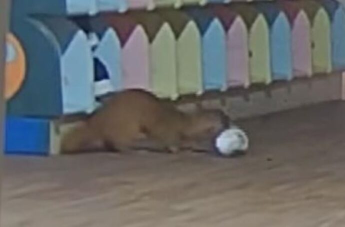 На видео видно, как ласка появляется из-за стены и совершает набег на тайники, где дети хранят домашнюю обувь.