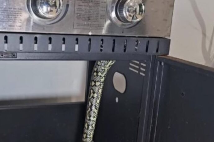 Австралийский специалист по борьбе с рептилиями прибыл в дом в Квинсленде, где внутри гриля для барбекю одного из жильцов был обнаружен огромный прибрежный ковровый питон.