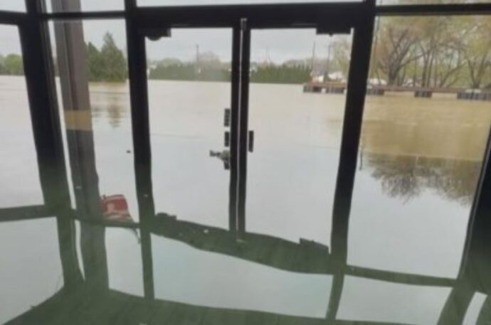 Эндрю Мастерсон, совладелец Captain’s Quarters Riverside Grille в Проспекте, опубликовал в Facebook видеотрансляцию, на которой он и его команда не допускают попадания илистой воды в здание.