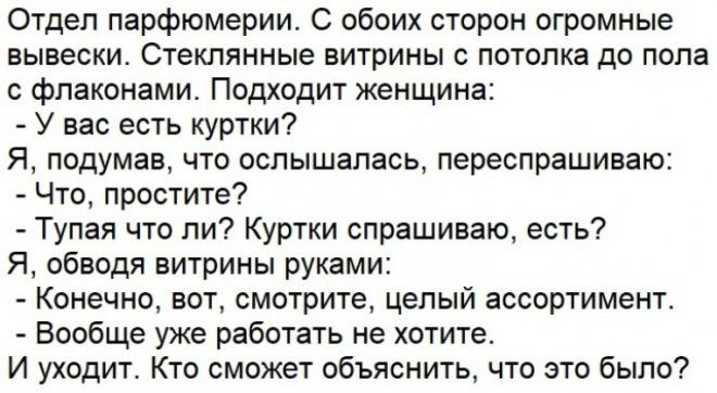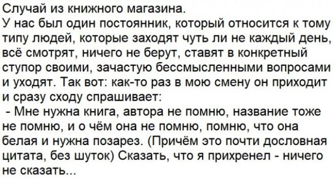 Курьезы Когда клиент всегда… не прав: Курьезные истории о непростых покупателях *** *** ‹ НазадДалее › ИнтереснокурьезыОбществоРАЗВЛЕЧЕНИЯ Минутка веселья: подборка анекдотов для удачного дня Женщина выиграла 154 168 долларов, используя одни и те же лотерейные номера в течение шести лет