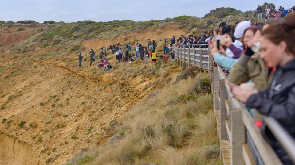 15. Туристы игнорируют предупреждающие знаки, чтобы сделать селфи. Двенадцать апостолов, Порт-Кэмпбелл, Австралия