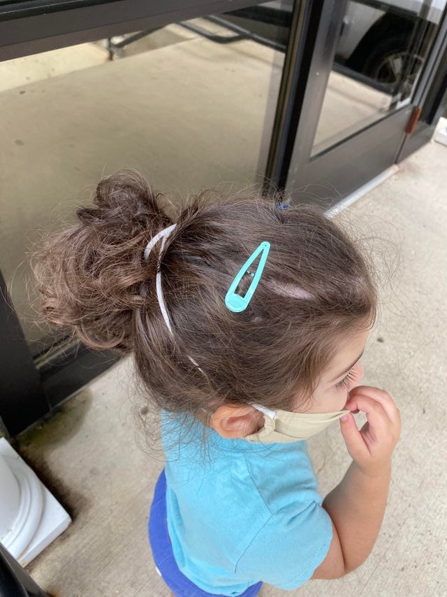Ребёнок может носить и взрослую маску — её можно завязать вокруг хвостика на голове.