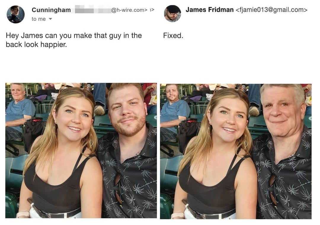 3. Хей, Джеймс, можешь сделать так, чтобы парень сзади выглядел немного счастливее?