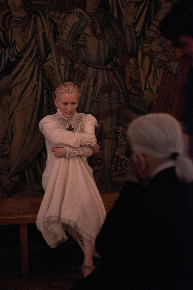 Тильда Суинтон и Карл Лагерфельд на съемках рекламной компании для межсезонной “шотландской” коллекции Chanel (2013)