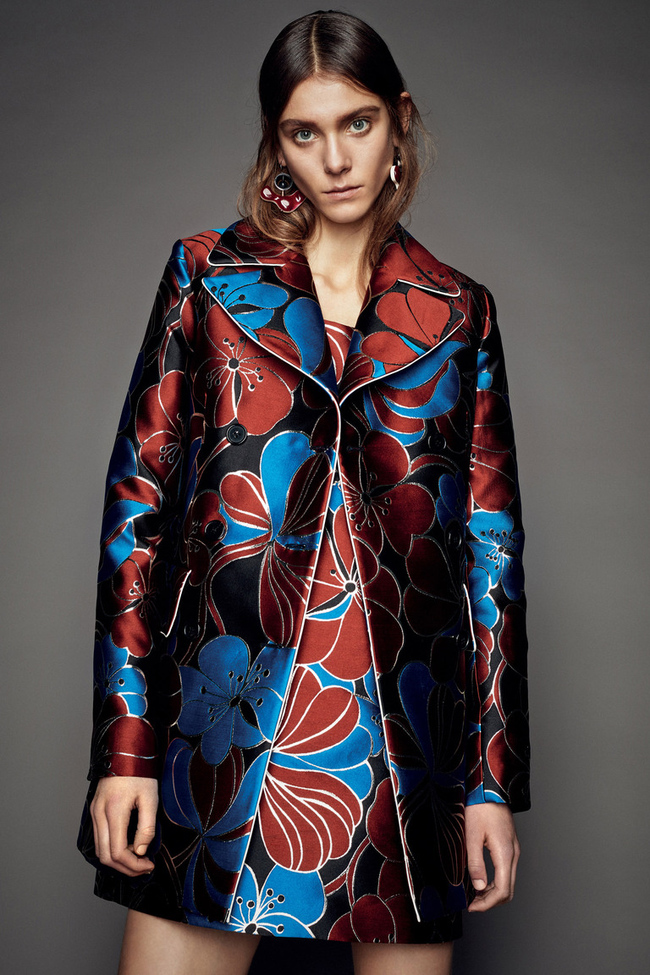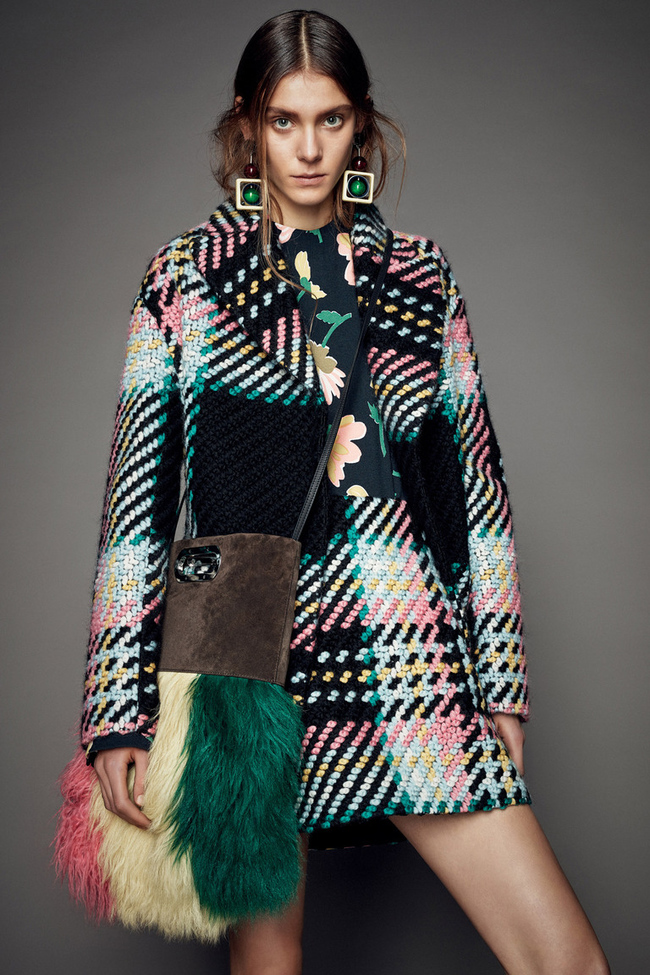 Ее главными инструментами в построении многослойных и сложных образов стали тонкие ткани с психоделическими принтами и разноцветный мех, который она как мозаику складывала на длинных жилетах и сумках. Также на помощь итальянке пришел блестящий жаккард — из него она сшила лаконичные короткие пальто и платья А-силуэта в цвет. Разнообразила и без того пеструю картинку цветная кожа и объемные аппликации на топах или юбках.