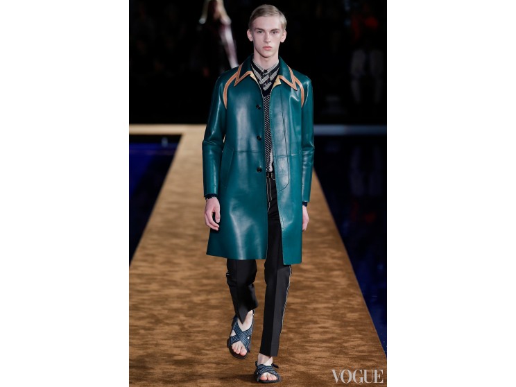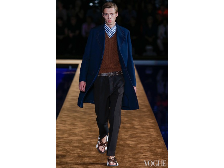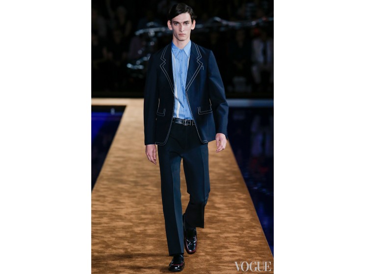 Миуччиа Прада выбрала стихию воды в качестве декорации к новой мужской коллекции и заставила манекенщиков дефилировать по узкому мосту над водной гладью. Однако представленная одежда с водой была лишь связана разнообразными оттенками голубого и синего, а ее фасон больше отсылал к аккуратным комплектам для работы в офисе.