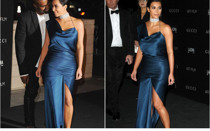 Ким Кардашян выбрала для церемонии LACMA Art and Film Gala в 2014 году атласное платье цвета голубой электрик, которое явно по размеру было ей велико, что испортило ее фигуру. Но, несмотря на объемный верх, на бедрах платье было чересчур узким, а ассиметричный разрез спереди создавал иллюзию того, что платье перекрутилось. Этот образ не только вызвал бурю негативных откликов, но и стал причиной слухов о ее беременности. Красивые волосы и макияж “smoky eyes” слегка спасли безнадежную ситуацию, что не скажешь о тугом колье на шее актрисы.
