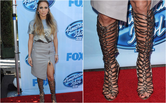 Смешанные чувства появились у тех, кто увидел образ Дженифер Лопес на красной дорожке в декабре 2014 года. На событии, посвященном фильму «Американский идол XIV» актриса появилась в топе от бельгийского дизайнера Седрика Шарлье, юбке от Томаса Уайльда и высоких металлических босоножках Clementine в стиле гладиаторов от Софии Вебстер. Если о верхней части образа актрисы, мерцающем топе и кожаной юбке, отзывались как о сексуально привлекательном, то об обуви такого не скажешь. Они ужасно контрастировали с образом. Создавалось ощущение, что Дженнифер в них дискомфортно.