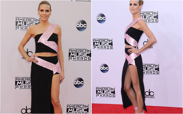 В 2014 году на церемонии American Music Awards длинноногая модель Хайди Ким шокировала всех, выбрав смелое ассиметричное черно-розовое платье от Версаче, благодаря чему ее длинные ноги стали еще длиннее. Эту ошибку усилили и розовые босоножки, которые не подходили к наряду. Мерцающие розовые полоски на платье звезды не придали шика. Все были согласны с тем, что икона стиля и модель должна была тщательнее подойти к выбору на церемонию. В этот раз она ошиблась!