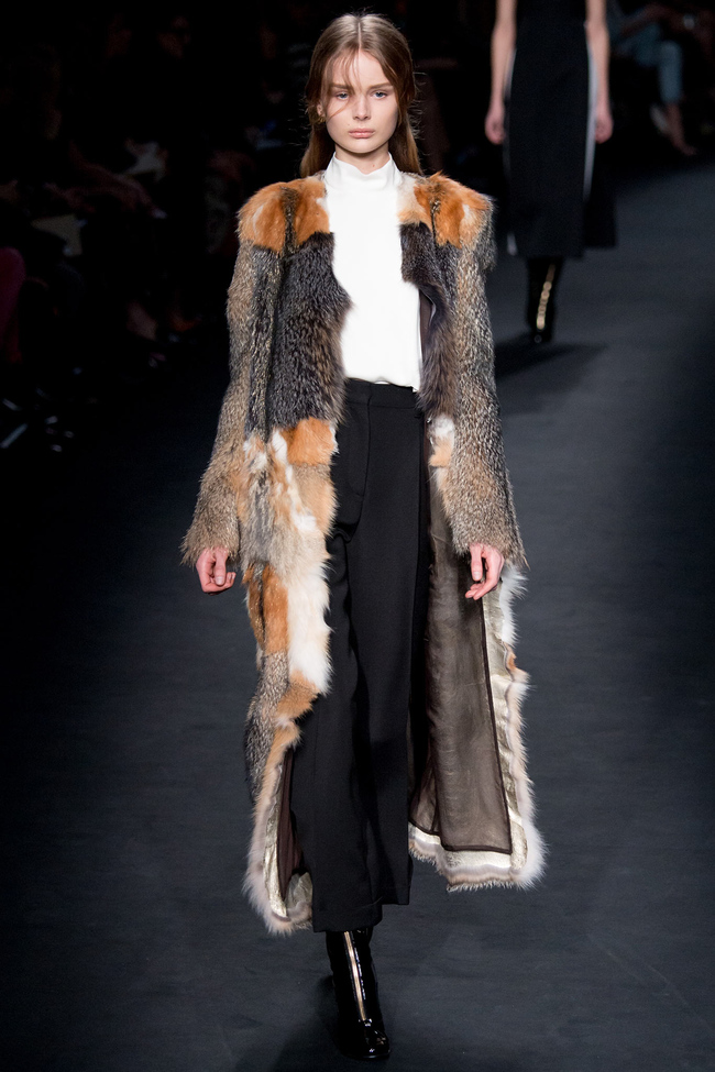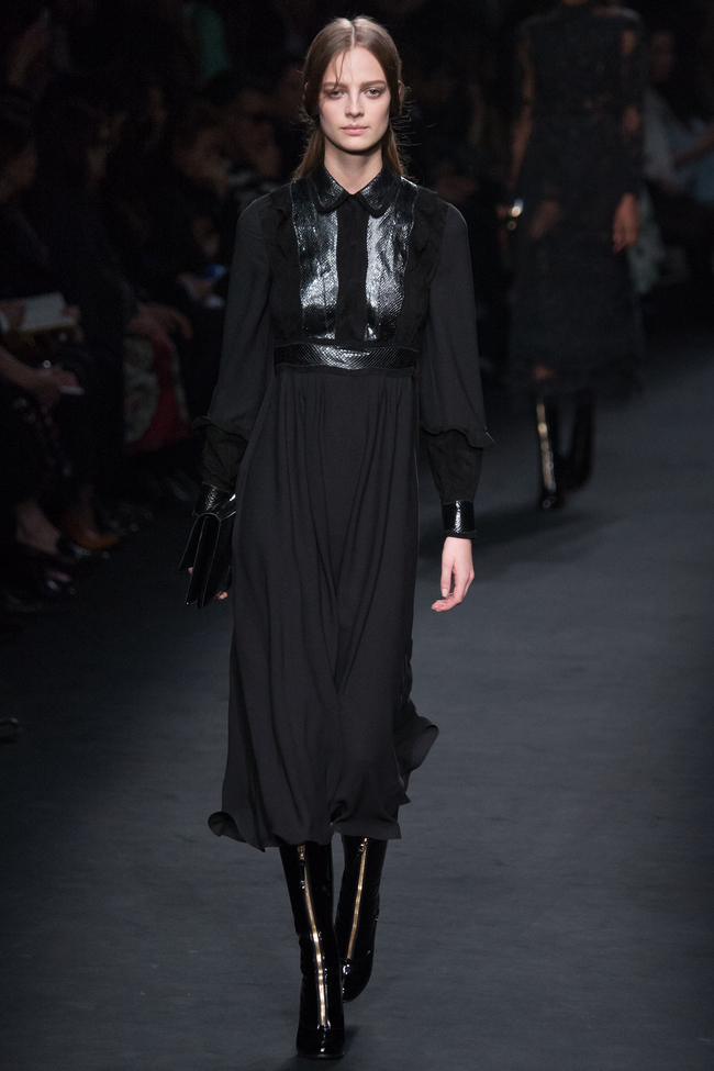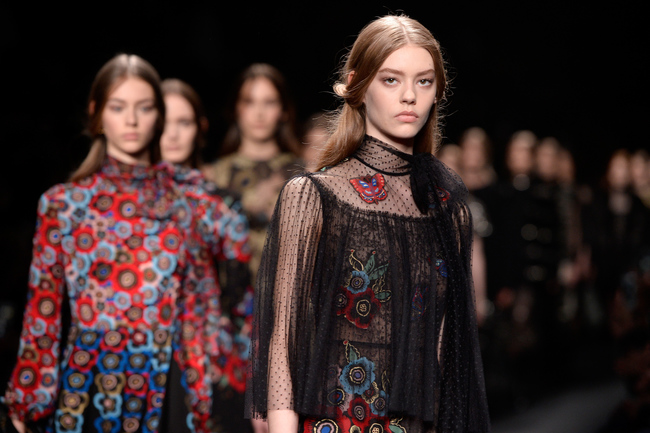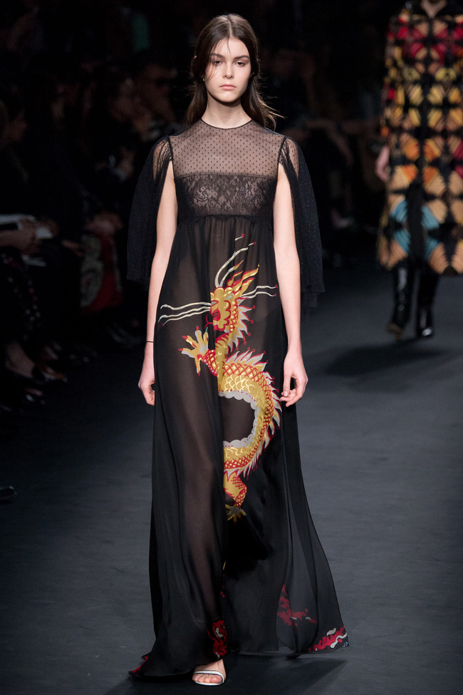 Платьям дизайнеры Valentino традиционно была посвятили большую часть коллекции. Кроме традиционных кружевных нарядов в пастельных тонах, на подиуме появились девушки в платьях с огромными золотистыми драконами, нарисованными Селией Биртуэлл. В свою очередь влияние Флёге и Климта ярче всего читалось на нарядах с растительными мотивами и шубах в свойственной художнику цветовой гамме.