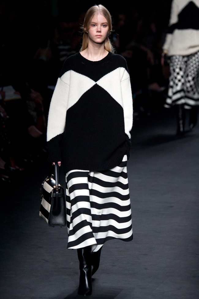 Открылся показ черно-белым графичным блоком. На платьях длины миди со свободной линией талии разместились контрастные полосы, треугольники и квадраты, которые затем сменились практически школьным сочетанием светлого верха и темного низа. Однако в битве темного и светлого у дизайнерского дуэта Valentino все-таки побеждает черный, который с каждым выходом становится все богаче и сложнее – Кьюри и Пиччоли смело комбинируют разные фактуры, а швы подчеркивают белой окантовкой, как сообщает vogue.ua.