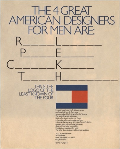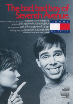 Новаторский подход не только к дизайну одежды, а и к рекламным кампаниям бренда не могли оставить молодую марку без внимания публики. В первый же год ее существования гуру рекламы Джордж Лоис создает для Tommy Hilfiger баннер, содержащий первые буквы имен и фамилий самых популярных на тот момент в Америке дизайнеров мужской одежды, и включает в него инициалы Томми Хилфигера. Это было смелое и амбициозное заявление.