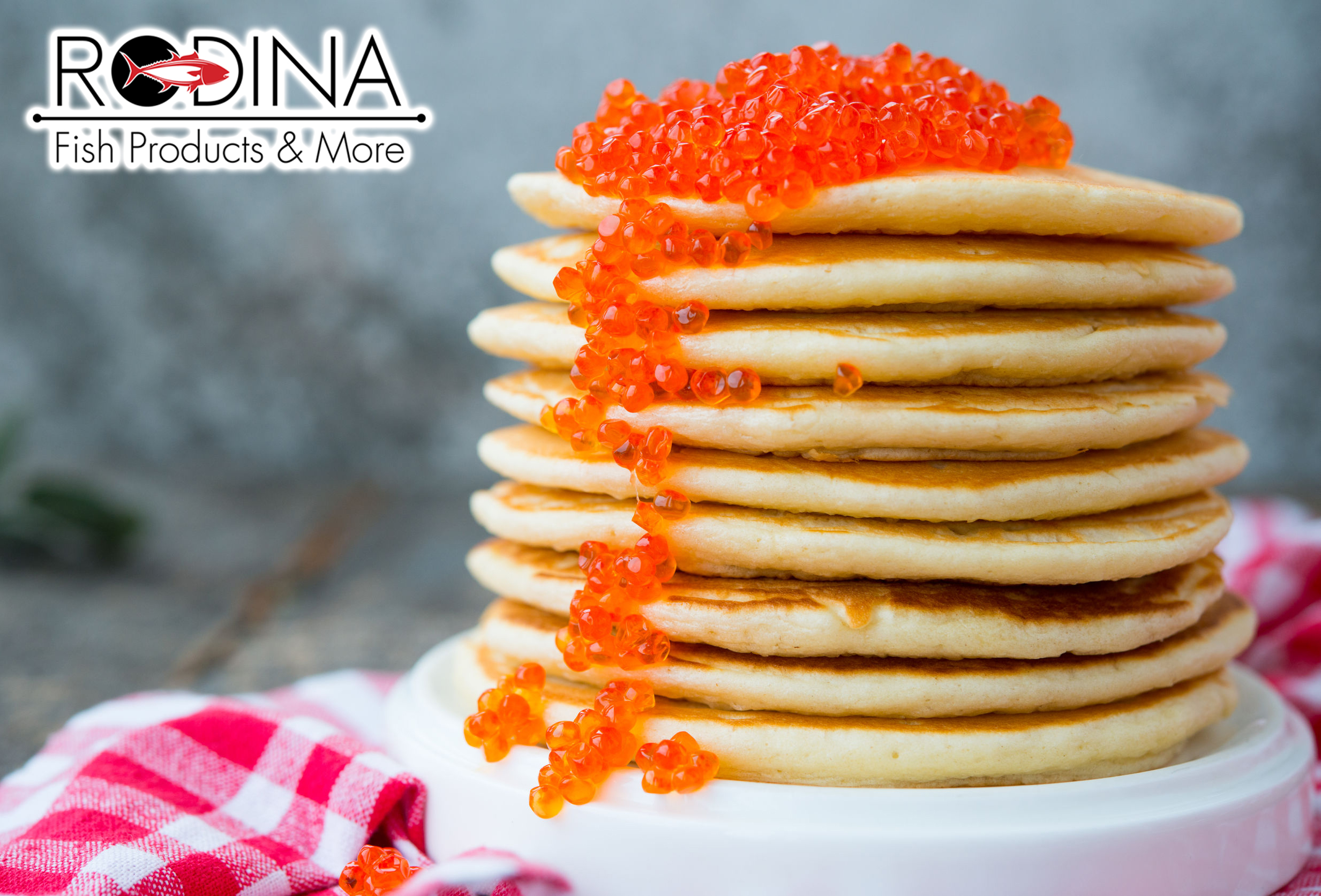 Close up tower of American pancake with red caviar stands on a wooden gray background. Horizontal photo.